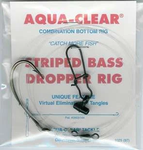 Aqua-Clear ST-7BHFF Striped Bass Dropper Rig. The Rig comes with 7/0 bronze bait holder/hook with fish finder and 4′ leader. Long sturdy hooks ensure catching and holding your fish. This rig is great for striper. Be prepared with Aqua-Clear.