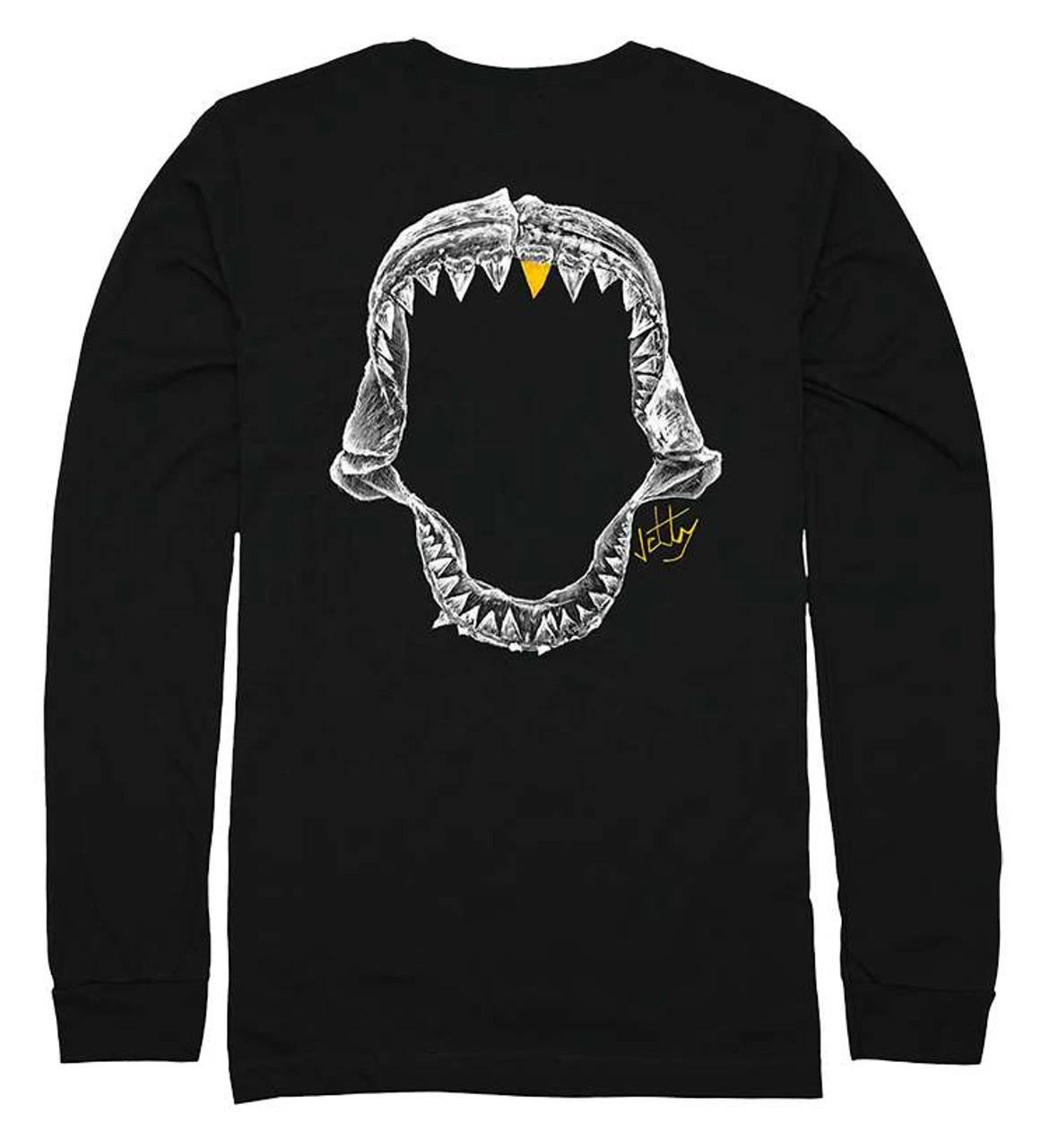 The Jetty Jaws Long Sleeve T-Shirt is made with comfortable, premium ultra soft 100% ringspun cotton material. It features shark jaw design on the back with small Jetty shark jaw logo on the front. The prints are printed with water-based discharge ink. Perfect for wearing as a layer underneath any Jetty jacket or flannel when you need that extra warmth. Ideal for those cooler summer or spring days on the water.