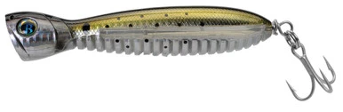 The Ocean Born Flying Popper Lure features a classic design with major enhancements when it comes to castability and versatility. Its side wings enhance aerodynamics and give the lure lift once it is in the water. Ocean Born Flying Poppers come in Floating, Sinking, and Super Long Distance models, with 4X treble hooks on the Floating and Sinking models and 6X treble hooks on the Super Long Distance models.