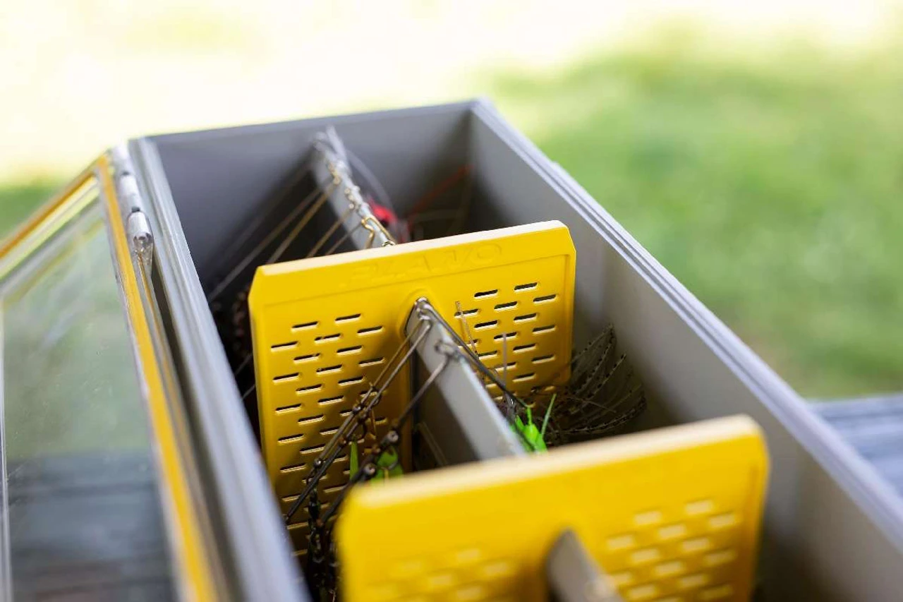 The Plano EDGE Spinnerbait Utility Box allows your spinnerbaits and buzzbaits to hang straight down without putting any added tension on the bait frame, which keeps them perfectly tuned and ready to use at all times. It also features a Dri-Loc watertight seal that keeps all of your spinnerbaits and buzzbaits in pristine condition and Rustrictor rust preventative technology molded into the base. The Plano EDGE Spinnerbait Utility Box can be used on its own with one open compartment, or combined with the four pre-cut dividers to create up to five separate compartments.
