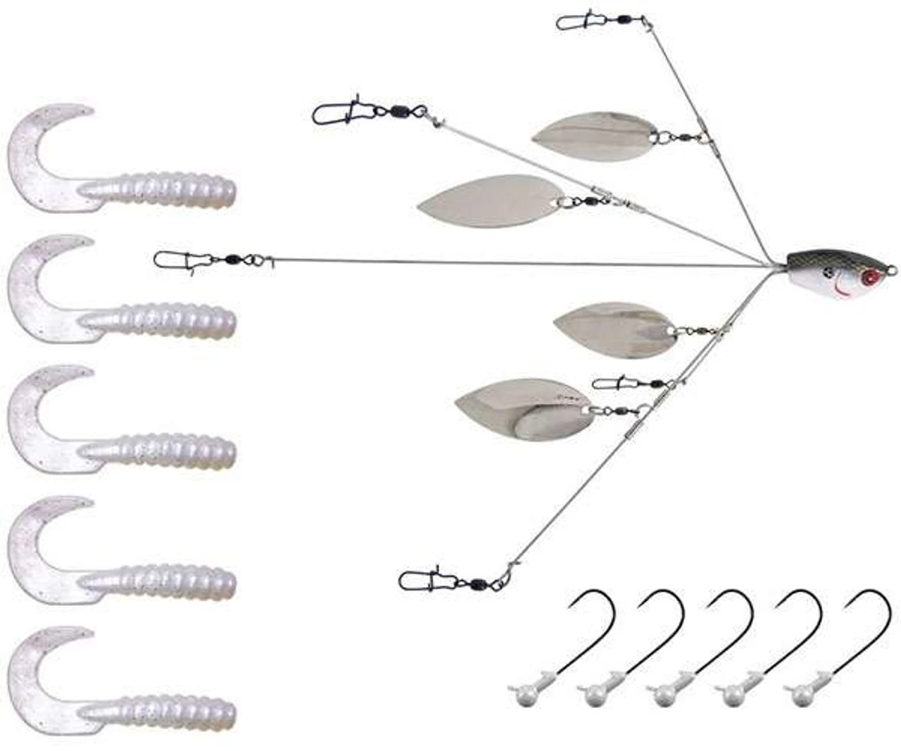The YUM YBLW5TSK1 YUMbrella 5 Wire Flash Mob Jr. Kit makes fishing a castable umbrella rig more efficient and effective than ever. The YUM YBLW5TSK1 YUMbrella 5 Wire Flash Mob Jr. Kit comes complete with all the jigheads and soft plastics you need to catch fish on the most efective multi-lure rig on the market. Kit includes one YUMbrella 5-Wire Flash Mob Jr. rig with willowleaf spinning blades positioned at the midpoint of each lure arm, plus three 1/8-oz. round ball jigheads with 2/0 hooks and three Pearl White curltail grubs.